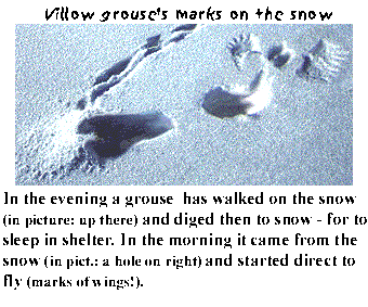 e feathers of the tail, so its very difficult to see in the snow. The feather layer in the winter is very effective against the cold, a real fur. Even legs are covered with feathers. In the summer willow grouse is mostly red-brownish only wings and stomach are white. Its track in the snow is very good distinctive mark. In the winter it sleeps under the snow cover, there can be tens of them in the same place. In April couples find their own territories. Willow grouse is monogamous.