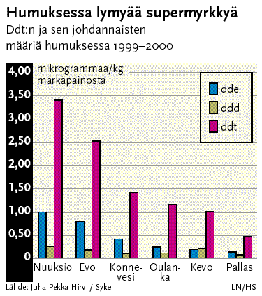 Ilmeisesti siis ddt:tä yhä käytetään jossain maamme lähialueilla. Pohjois-Suomessa niitä on kuitenkin selvästi vähemmän kuin Etelä-Suomessa. Myrkky kerääntyy eläinten rasvakudoksiin aiheuttaen esim. linnuissa sukupuolimuutoksia ja petolintujen munankuoren ohentumista. Selkälokkikanta romahti Söderskärillä (Suomelahdella) viime vuosisadan lopulla. Lokkeihin kerynyt ddt oli ilmeisesti peräisin Afrikasta, jossa nämä lokit elokuu-toukokuu välisen ajan joka vuosi. - Lähde: HS 21.10.03: Supermyrkkyä selkälokeissa/SYKEn tutkija Juha-Pekka Hirvi.